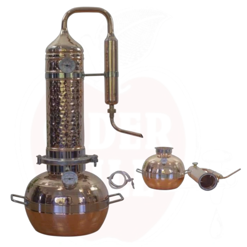 Hochwertiger Destillierapparat, bestehend aus einem 10-Liter-Kessel und einer Kolonne mit 10 cm Durchmesser und 3,2 Liter Kapazität (z.B. für pflanzliche Rohstoffe). Die Kolonne wird mit einer 4-Zoll-Klammerbefestigung am Kessel befestigt, was eine sichere und dichte Verbindung gewährleistet. Thermometer sind nicht im Lieferumfang enthalten.