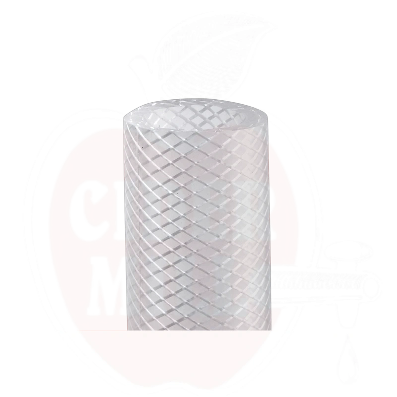 Hochwertiger, transparenter Lebensmittelschlauch aus hygienischem TPE-S Gummi, verstärkt mit strapazierfähigem Polyestergarn. Der Schlauch ist nach EU 10/2011 und FDA CFR-21-177.2600 Standards zertifiziert.