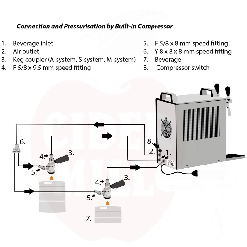 Für die Installation des Geräts müssen Schlauch- und Behälteranschlüsse separat erworben werden. Bei Verwendung von Metallfässern wird ein CO2-Flaschendruck von 2,5-2,9 bar empfohlen.
