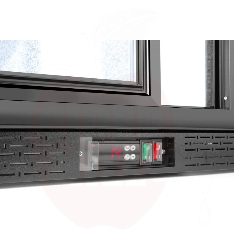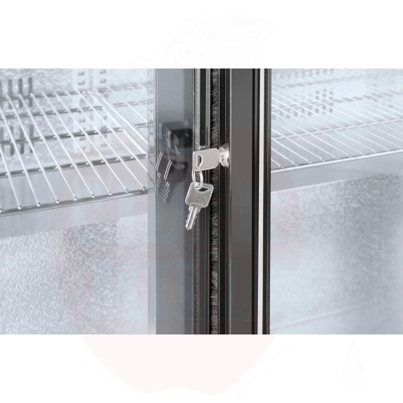 Der praktische Getränkekühler ist mit komfortablen Schiebetüren ausgestattet, die in geöffneter Position sicher verriegelt werden können. Dies gewährleistet eine sichere und effiziente Bedienfreundlichkeit im täglichen Gebrauch.