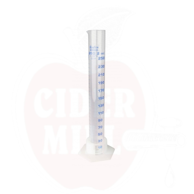 Präziser 250ml Messzylinder aus Glas für professionelle Flüssigkeitsmessungen. Die Messskala mit 2ml Genauigkeit gewährleistet präzise Messergebnisse bei Saftproben und Flüssigkeitsdosierung.