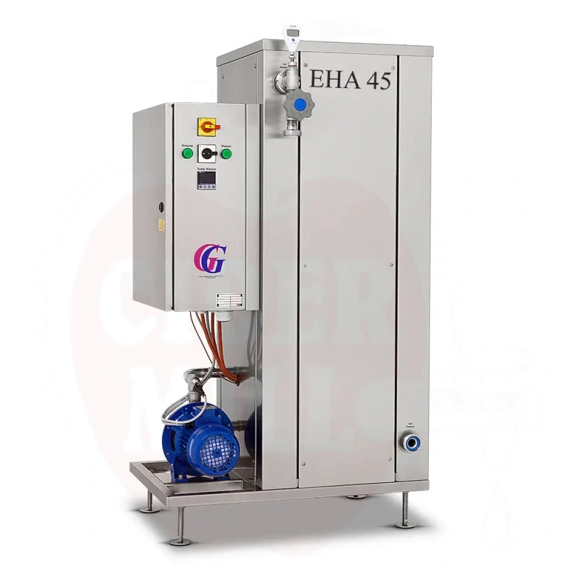 Der EHA-45 Pasteurisator ist ein effizientes Saftverarbeitungsgerät mit einer Verarbeitungskapazität von bis zu 450 Litern pro Stunde. Der leistungsstarke 45kW Heizkörper (400V/80A) gewährleistet einen schnellen und gleichmäßigen Pasteurisierungsprozess bei +80°C.