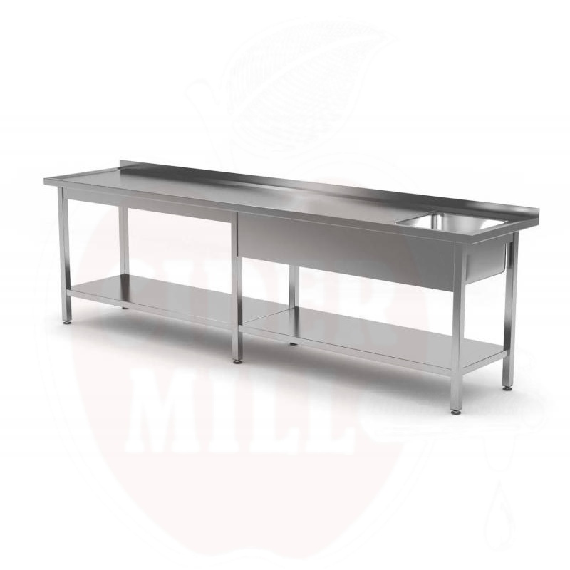Hochwertiger Edelstahl-Arbeitstisch für professionelle Küchen, hergestellt aus AISI 304 Edelstahl. Die robuste Konstruktion gewährleistet eine langlebige Nutzung in Großküchen. Die Spüle mit den Maßen 400x400x250 mm befindet sich auf der rechten Seite und ermöglicht einen effizienten Arbeitsablauf.