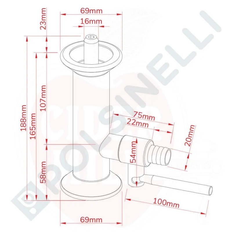Eigenschaften: Aus Edelstahl AISI 304 gefertigt, mit GA40-Anschluss, poröser Kerze und Kugelventil mit 20" Schlauchtülle.
