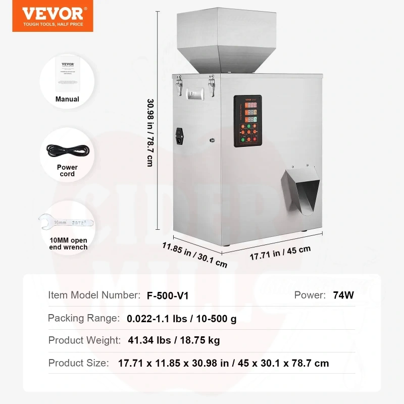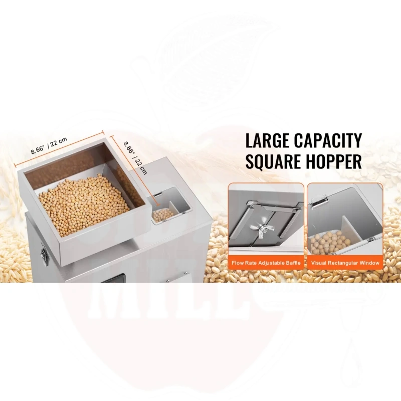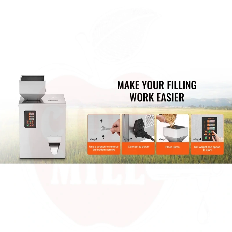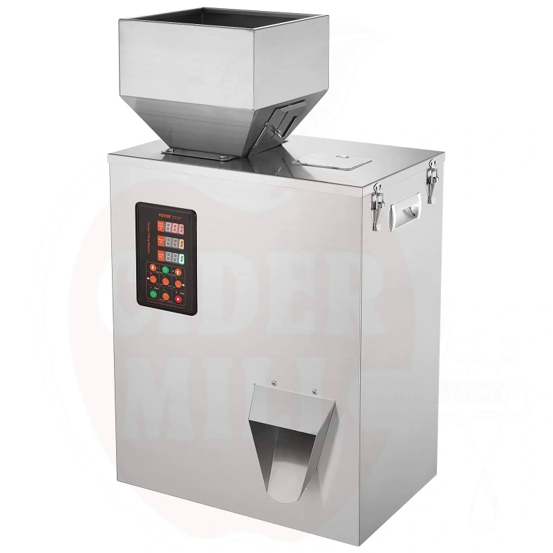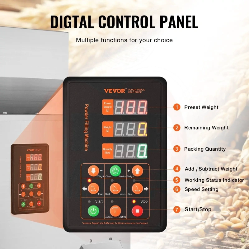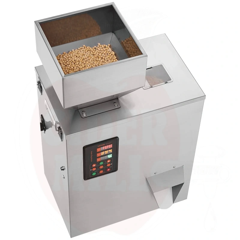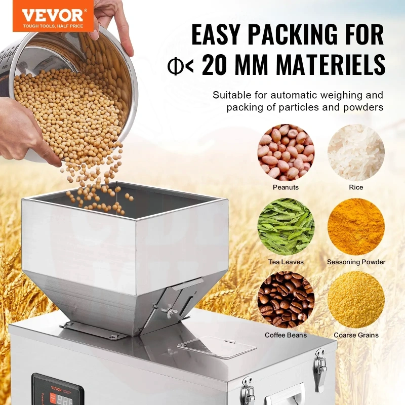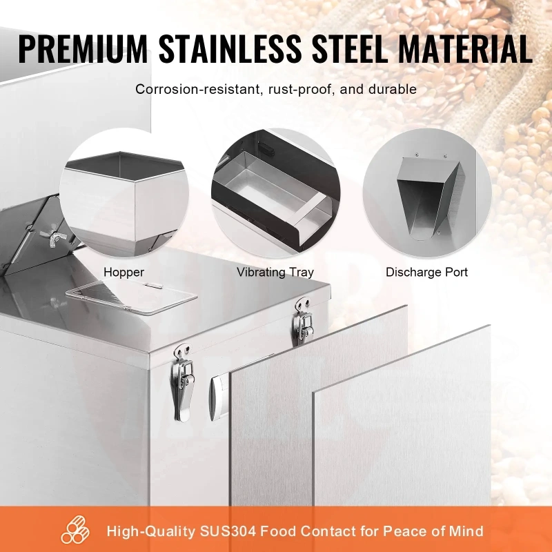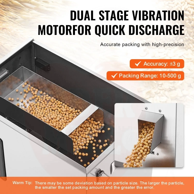 Robustes Edelstahlgehäuse und lebensmittelechte AISI304-Hauptkomponenten (Trichter, Vibrationsplatte, Wiegebunker, Auslassöffnung) gewährleisten lange Lebensdauer und hygienische Verarbeitung.