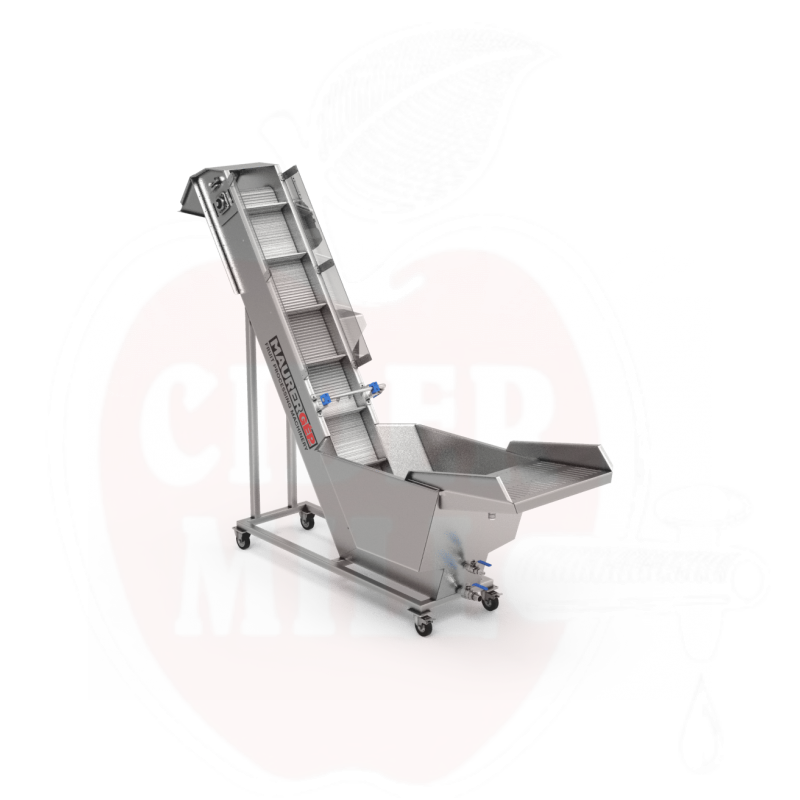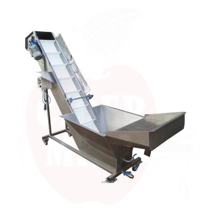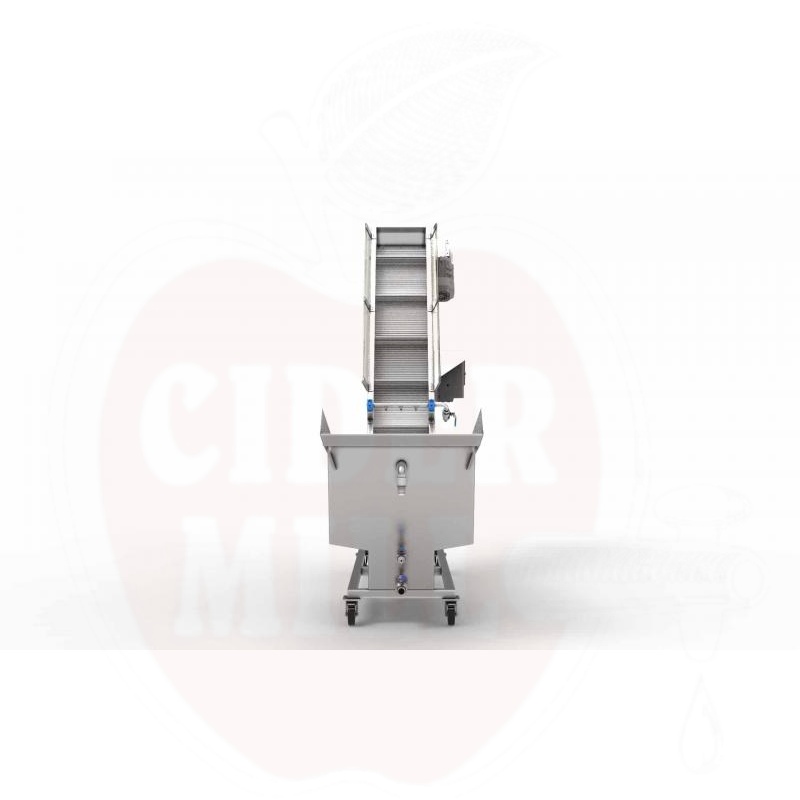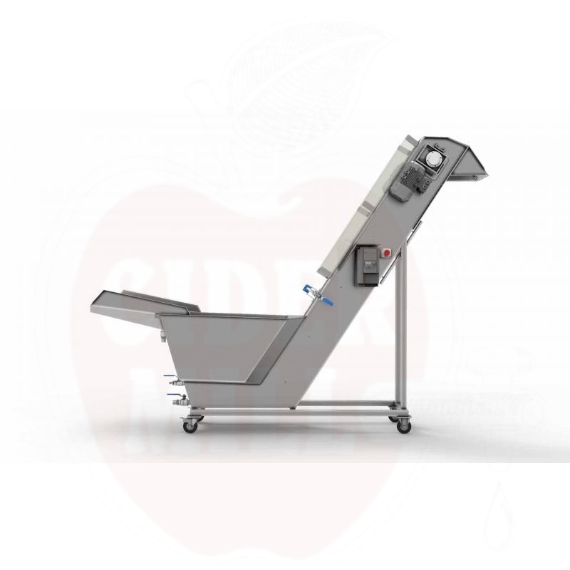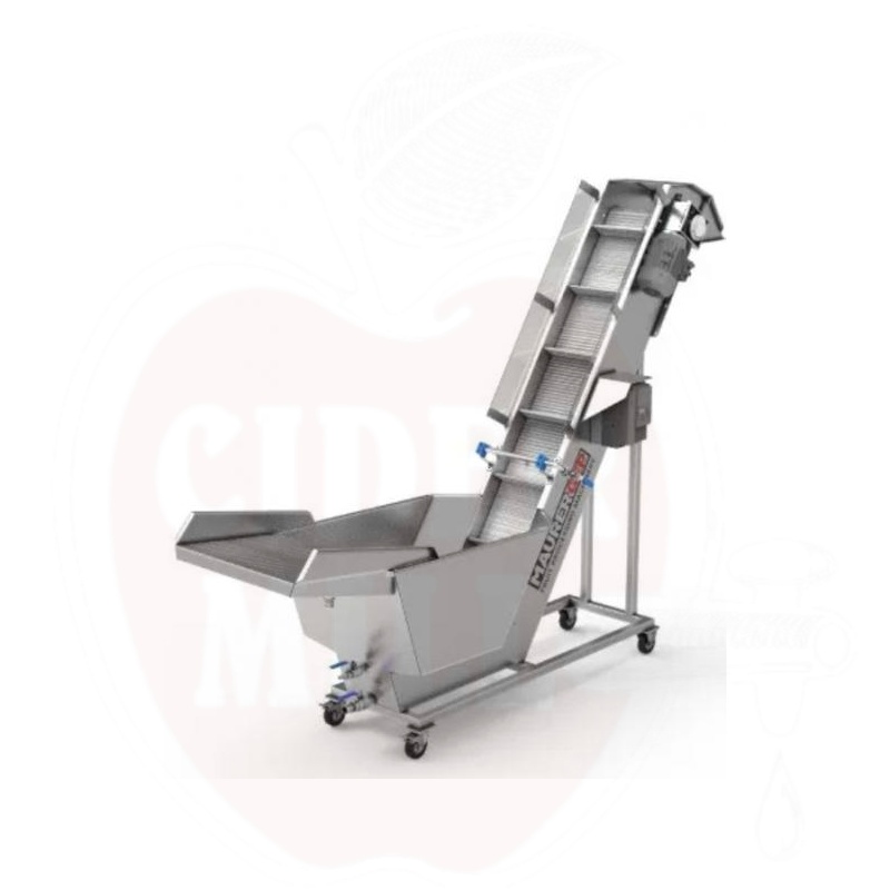 Obstwaschgerät mit auf einem Gürtel mit Bad-Spülung und klarem Wasserspray. Leicht zu reinigen, mit einem massiven modularen Lift aus Polypropylen/Acetal, stufenlos einstellbarer Geschwindigkeit in beide Richtungen, 2 drehbaren, 2 festen Rädern oder mit vibrationsfreien Füßen.