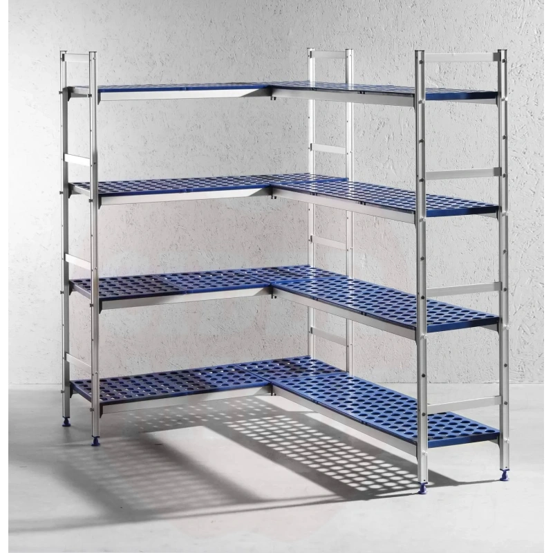 The shelving system is ideal for food processing areas, kitchens, and storage areas where high hygiene requirements are essential. The aluminum frame is corrosion-resistant, and the plastic covers are durable for daily use.