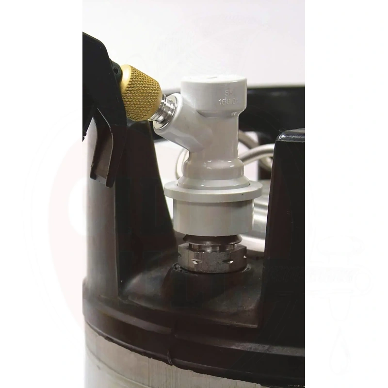 Practical accessory for 18.9L KEG pressure barrel that ensures freshness and proper carbonation of your beverages. The holder is equipped with a 1/4" thread and is ideal for use with white ball-lock quick connect.