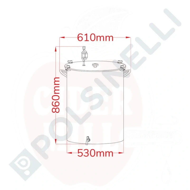 Technical data: Capacity: 150L. Height: 705mm. Diameter: 530mm. Wall thickness: 0.6mm. Bottom thickness: 0.7mm. Lid: high thickness stainless steel with hermetic seals. Includes ½" stainless steel tap and digital thermometer.