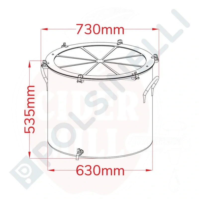 Features: Built in AISI 304 stainless steel with flower embossed exterior. Rounded welded bottom for easy cleaning. Complete with thick stainless steel lid with cotton, 4 stainless steel hooks for lid sealing, welded stainless steel bushing, 3/4" stainless steel tap, and stainless steel handles for moving.