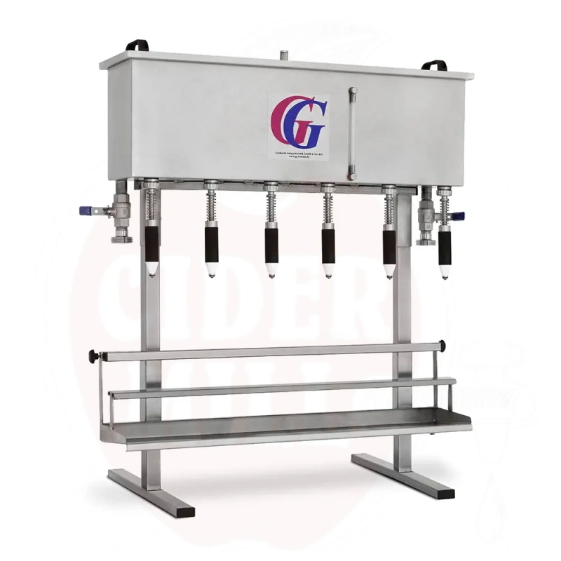 Gravity filler GG RF6 with 6 filling valves for hot filling of bottles. Adjustable filling height for different bottle sizes. No electricity required – operates by gravity.