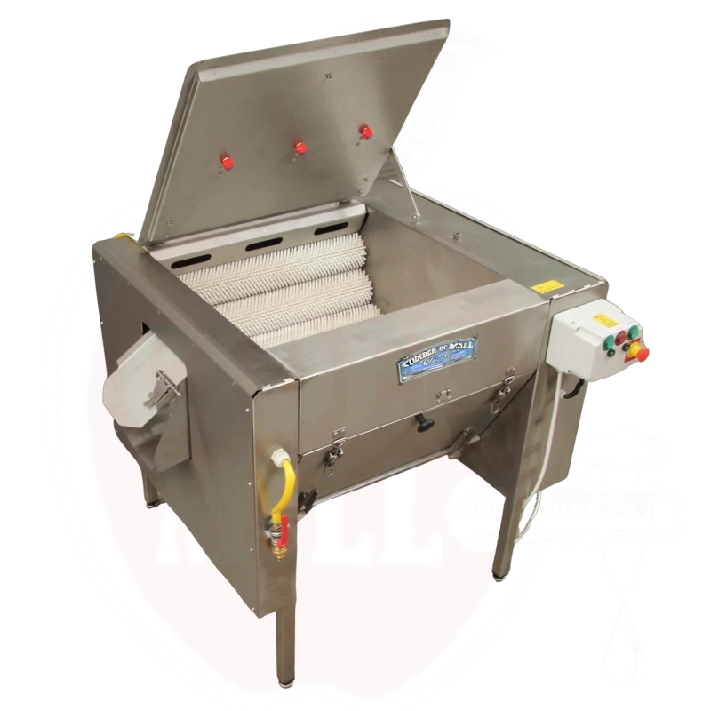 Professional vegetable and root crop washing machine is equipped with nine cylindrical brushes that ensure thorough cleaning results. The device operates under continuous water spray, combining efficient brushing and pressure washing.