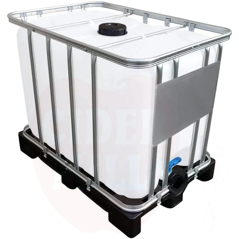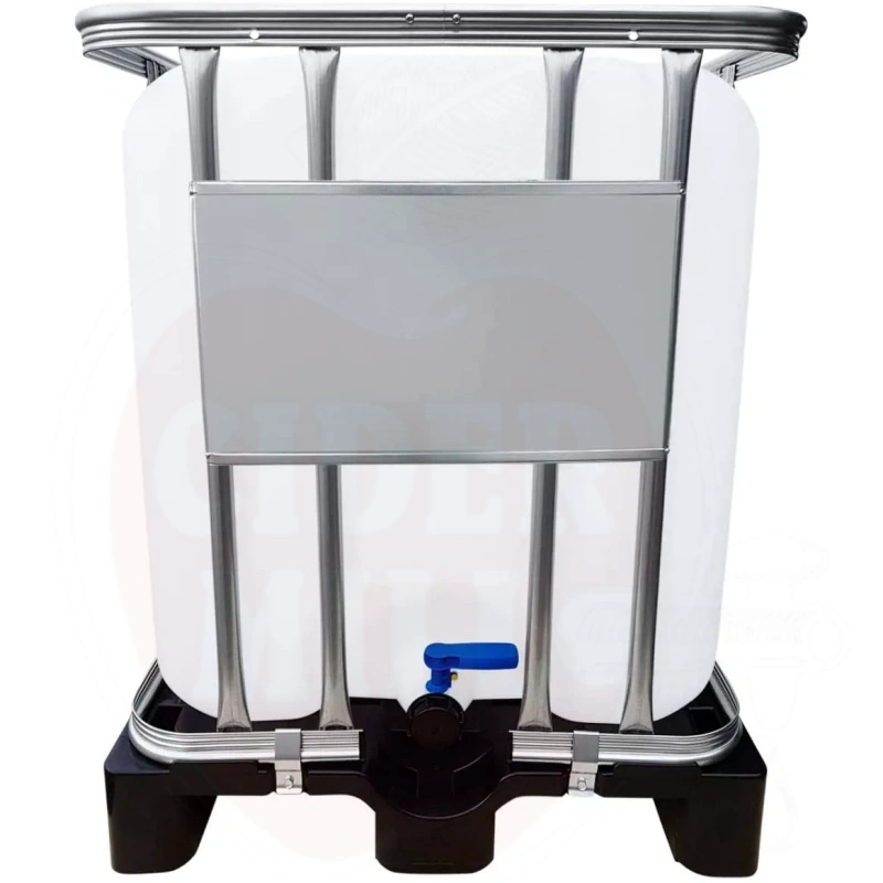 Durable and certified IBC container for safe handling of food liquids. Reinforced base frame and durable plastic base ensure long-term reliability.