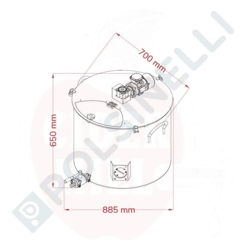 Technical data: Capacity: 150L. Power supply: 220V, 0.09kW, gearmotor 28 RPM. Inside diameter: 630mm. Height: 490mm. Overall dimension with motor: 760 × 650mm (h). Wall thickness: 1mm. Bottom thickness: 1.5mm. Not suitable for induction. Fitted with CLAMP 1" 1/2 stainless steel valve and hose connector. Reinforced stainless steel lid and handles.