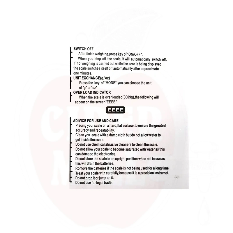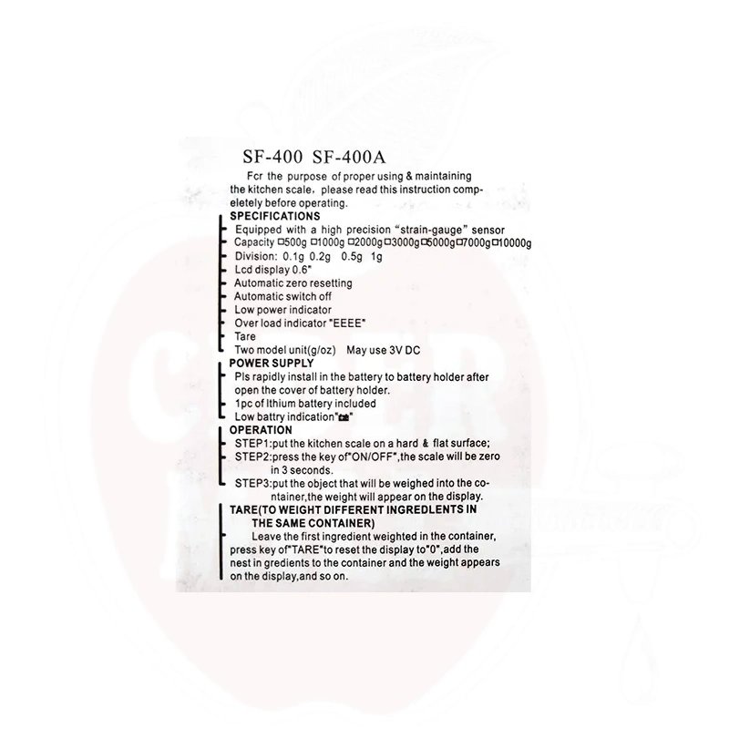 Features: Digital LED display with auto switch off and manual "On/Off" button for battery life saving. The high precision function offers a large 10000g capacity with precise 1g accuracy.