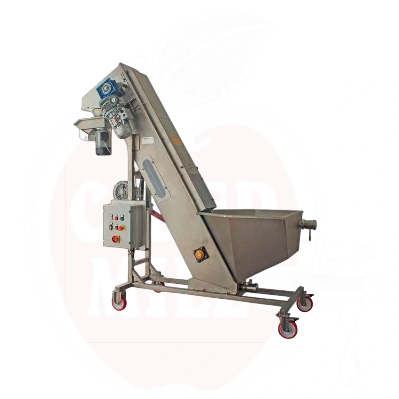 Professional stainless steel (AISI 314) fruit washing equipment with integrated feeding conveyor and crusher. The device is fully automated and ideal for industrial fruit washing and processing.