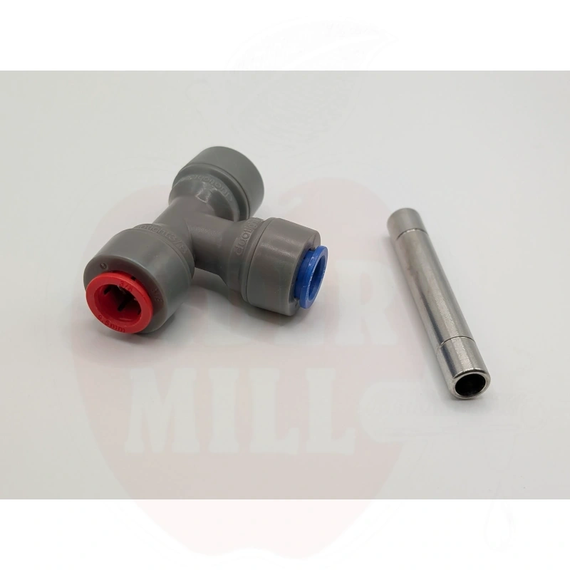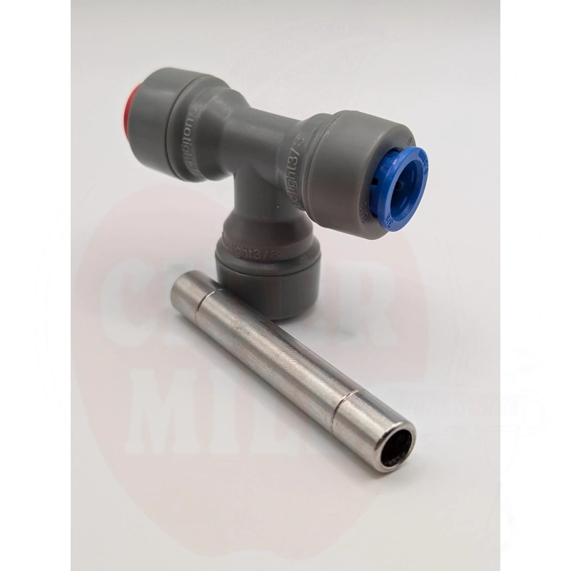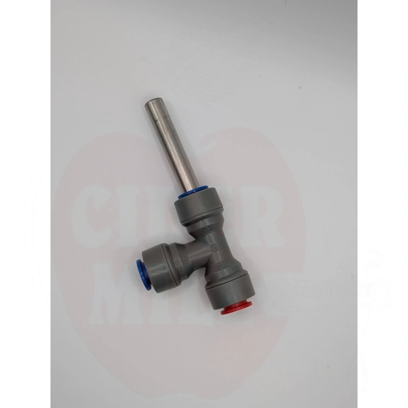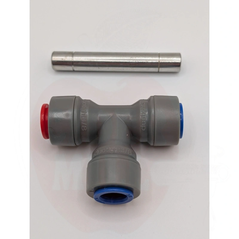 Usage: T-Piece Duotight fitting designed for beverage dispensing systems, featuring a 9.5mm (3/8") connection with one specialized input port fitted for thermowell probes measuring 3.5-4.5mm in diameter.