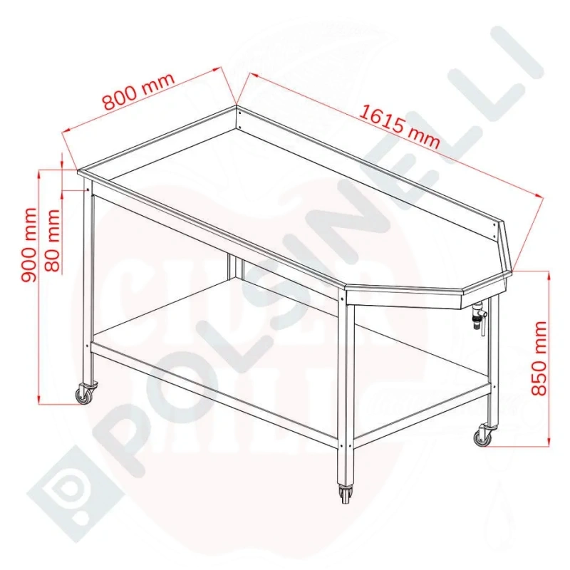 Properties: Entirely constructed with AISI 304 stainless steel. Top surface has special hole with AISI 304 3/4" DN15 ball valve hose nozzle for fast liquid discharge. Includes undershelf and 4 wheels (2 lockable with brakes) for easy transport and stability. All surfaces are smooth for hygienic cleaning.