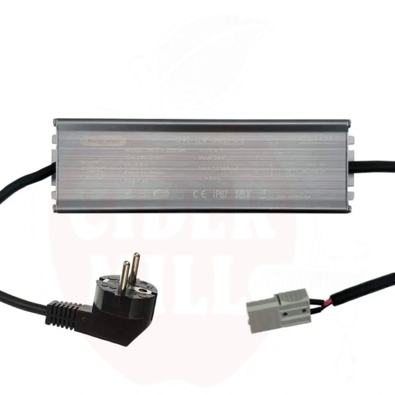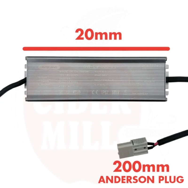 Technical data: Input Voltage: 220-240V AC (50-60Hz). Input Current: 1.9amp. Output Voltage: 24V. Output Current: 12.5amp. Efficiency: greater than 90%. PF: greater than 0.95. Overload Protection: Yes. Outlet Plug: Anderson Socket.