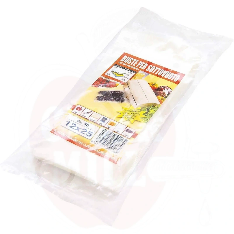 Technical data: Bag size: 12x20cm. Pieces per box: 4000. Max temperature: 70°C. Embossed for easy vacuum packaging.
