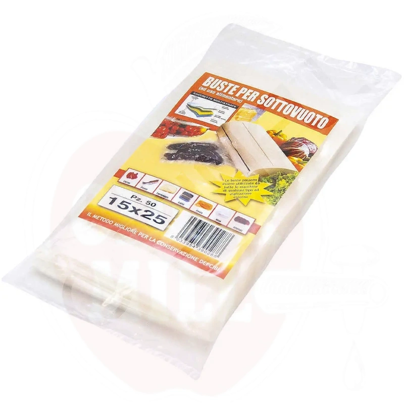 Usage: Embossed polyethylene vacuum bags 15x25cm are designed for vacuum packaging and long-term preservation of fresh or cooked foods such as meat, sausages, cheeses, vegetables, bread, fish, and legumes. Suitable for both domestic and small production uses.