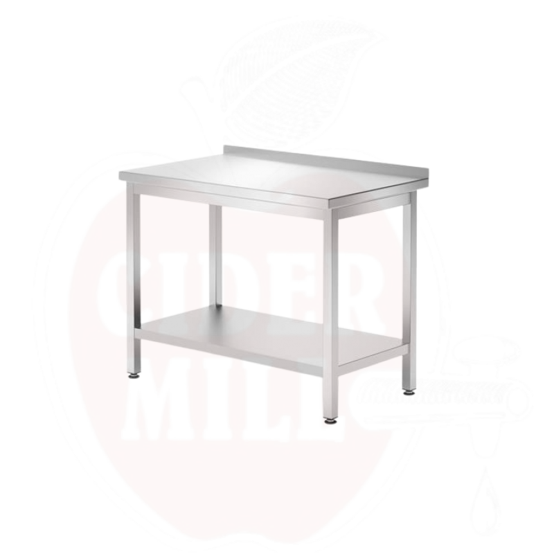 Bolt-on construction allows for self-assembly, simplifying transport and storage. Made of stainless steel. Work surface is reinforced with bottom longitudinal profile. Approximate allowed load capacity of work surface: 70 kg/m². Back wall has a 40 mm high splash guard that protects the wall from stains. Legs are made from 40x40 mm profiles. Adjustable legs range: +25/-5 mm. Non-adjustable shelf - distance from floor to bottom edge of shelf is 160 mm. Approximate allowed shelf load capacity: 70 kg/m². Length: 1000 mm, width: 600 mm, height: 850 mm.