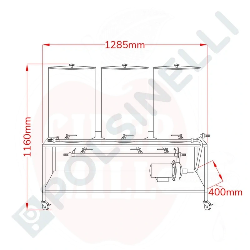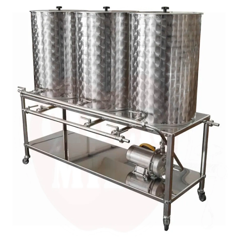Features: Equipped with a stainless steel electrical pump (1.4 HP), single-phase 230/400V 50Hz supply, with a flow rate of 110 liters per minute. The system includes DIN 15 stainless steel valves and connectors, with an operating temperature up to 110°C. The tanks feature a bottom valve and a front valve (40mm from bottom) for efficient residue management. Compatible with alkaline and sanitizing solutions as well as water.