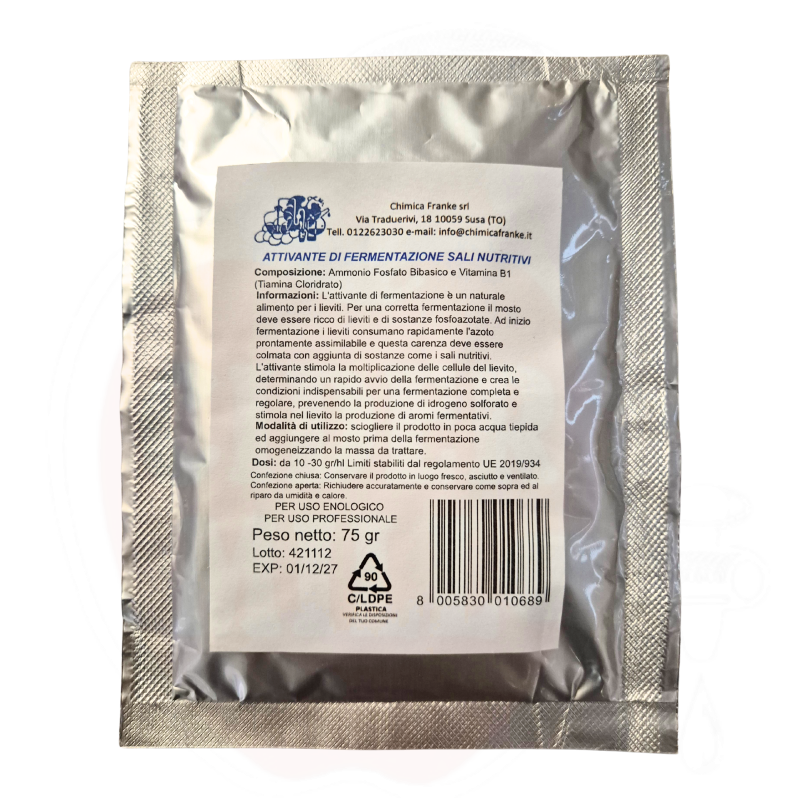 The activator contains diammonium phosphate and vitamin B1 (thiamine hydrochloride), which are essential components in successful winemaking process.