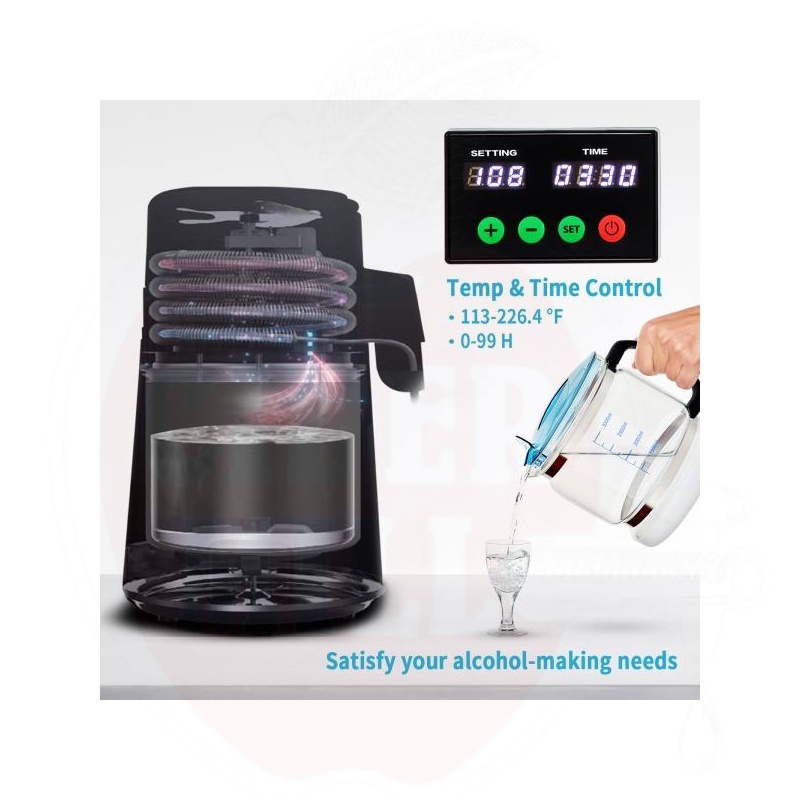 Seadistatav taimer (0-99 tundi) võimaldab täpset temperatuurikontrolli destilleerimisel. 4-liitrise koguse puhul on soovitatav 3,5-tunnine tsükkel, mis aitab vältida katlakivi teket.