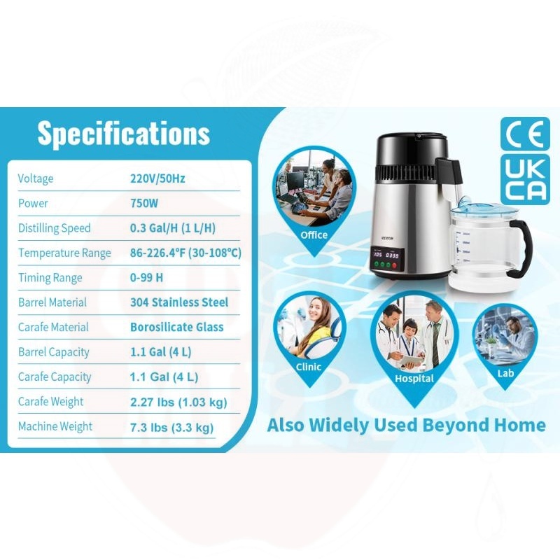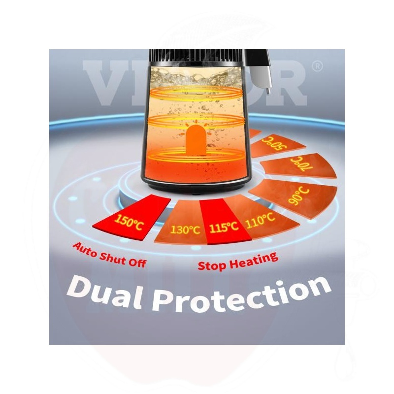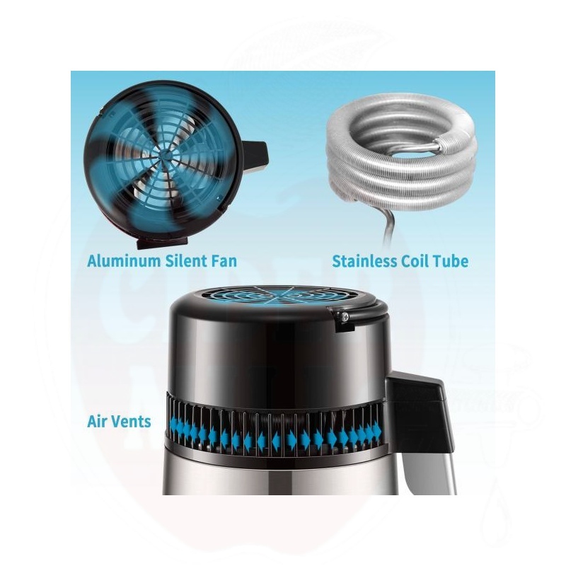Võimas 750W kütteelement tagab puhta destilleeritud vee tootmise kiirusega 1 liiter tunnis (24 liitrit ööpäevas). Seade eemaldab veest tõhusalt tahked ained ja orgaanilised ühendid.
