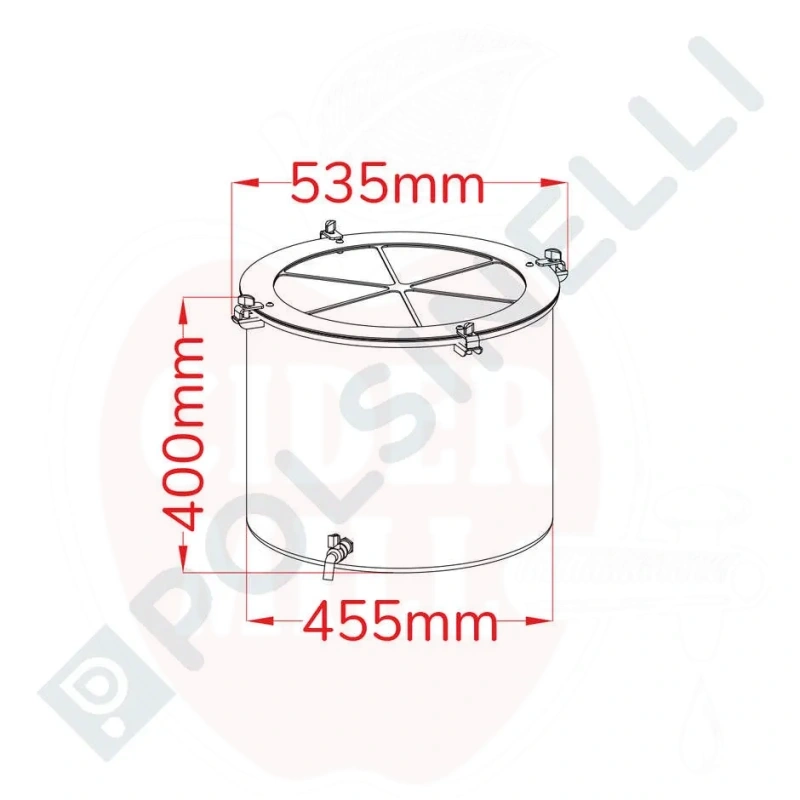 Omadused: Valmistatud AISI 304 roostevabast terasest, lillekujulise reljeefiga välimusega. Ümmargune ja keevitatud põhi lihtsaks puhastamiseks. Komplektis paks roostevabast terasest kaas puuvillaga, 4 roostevabast terasest konksud kaane sulgemiseks, keevitatud roostevabast terasest muhv ja ½" roostevabast terasest kraan.
