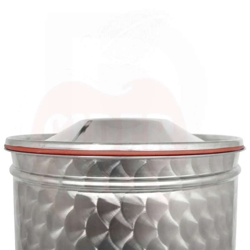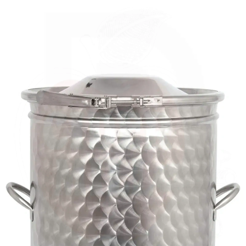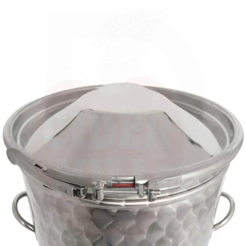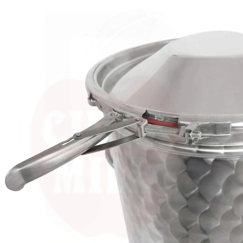 Omadused: Valmistatud 18/10 roostevabast terasest (AISI 304) väljastpoolt satineeritud ja seestpoolt peegelpoleeritud pinnaga kergeks puhastamiseks. Kooniline kaas tihendiga ja reguleeritava klambriga tagab veekindluse. Lame, ümarendatud ja keevitatud põhi, tugevad sangad ja roostevaba terasest kraan.