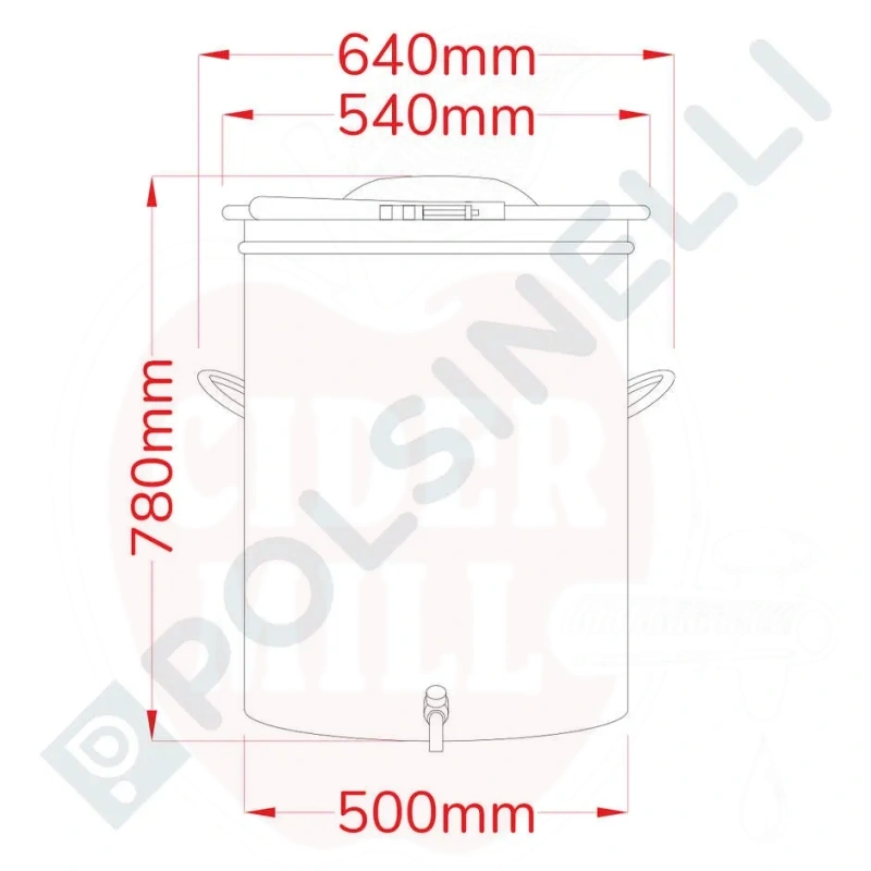 Tehnilised andmed: Maht: 120L. Siseläbimõõt: 500mm. Kogukõrgus: 650mm. Seina ja põhja paksus: 1,2mm. Kaas: kooniline suletud, klambritega kinnitatav. Kraan: roostevaba teras 1/2".