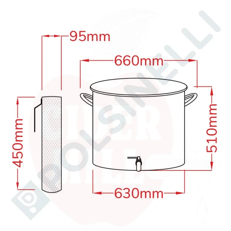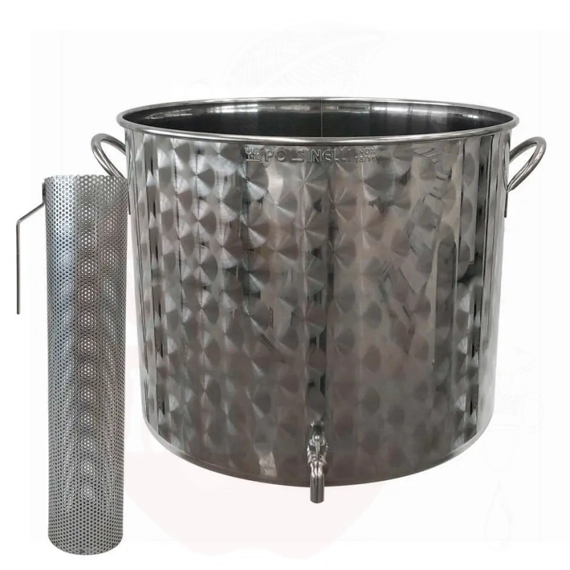 Omadused: AISI 304 roostevaba teras, lillemustriga välimine pind, peegelpolestatud sisemus, 3/4" kraan, 2 külgsanga, eemaldatav perforeeritud silinder (Ø95mm x 450mm) sangaga. Ümarik keevitatud põhi (ei sobi otsese leegiga kontaktiks).