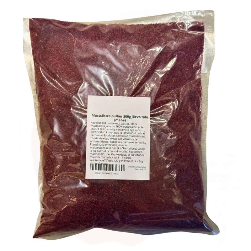 Toote põhiomadused: Eesti mahepõllumajandusest pärit kuivatatud ja jahvatatud mustsõstar (Ribes nigrum), netokogus 120g