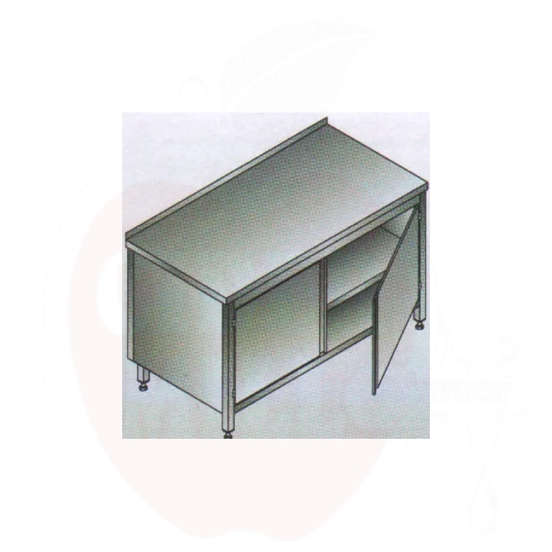 Praktiline roostevabast terasest töölaud professionaalsele köögile, varustatud mugavate avatavate ustega kappidega. Valmistatud kvaliteetsest 304-seeria roostevabast terasest, mis tagab pika kasutusea ja lihtsa puhastamise.