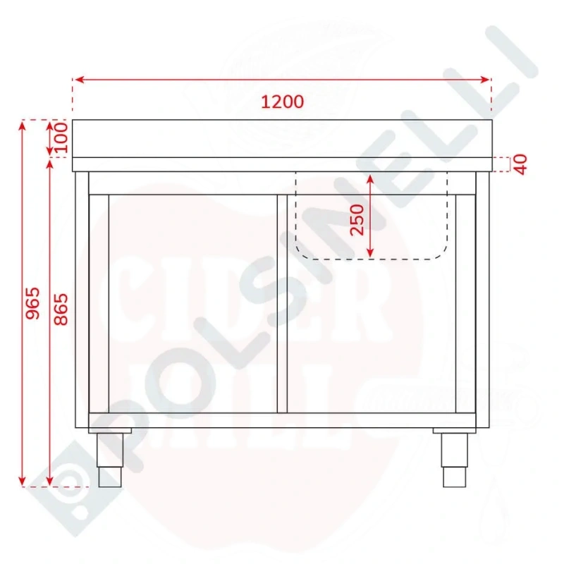 Tehnilised andmed: Mõõdud: 1200x600x865mm (pluss 100mm tagasein). Valamukauss: 400x500x250mm. Materjal: AISI 304 roostevaba teras. Terase paksus: 0,8mm. Uksed: 2 liuguvat. Nõrgutiplaät: Vasak. Reguleeritavate jalgade kõrgus: min/max 2cm.