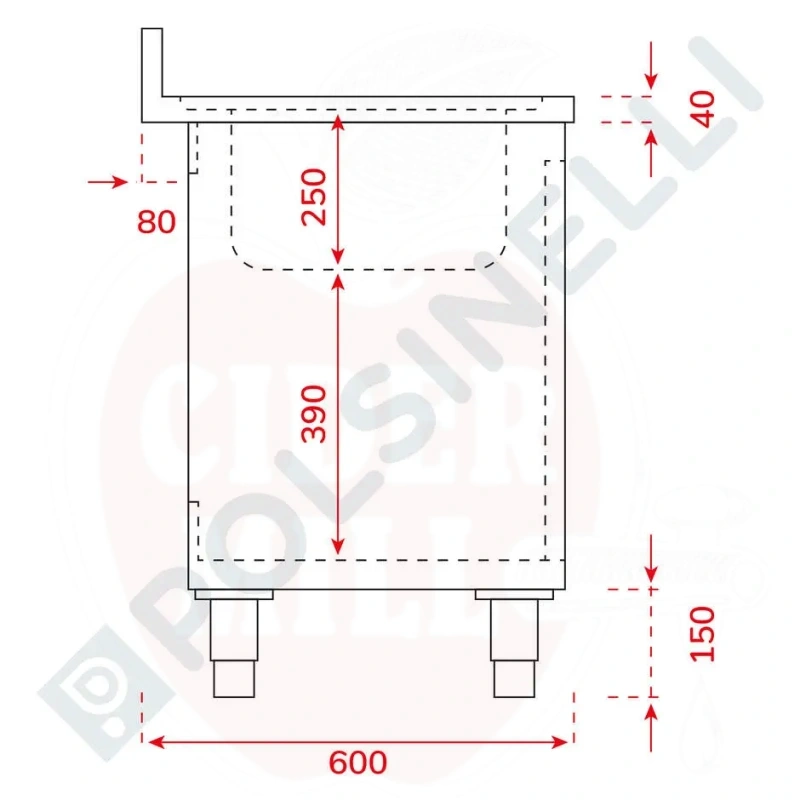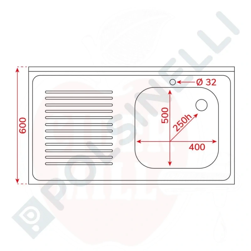 Omadused: Valmistatud vastupidavast AISI 304 (18/10 toidukvaliteediga) roostevabast terasest tugevusega 0,8mm pikaealisuse ja hügieeni tagamiseks. Varustatud suure valamukausi (400x500x250mm), 32mm segistiaugu, tagaseina (100mm) ja kahe libiseva rulluksega mugavaks ligipääsuks. Reguleeritavad jalad võimaldavad kõrguse kohandamist. Standardvarustuses 1½" äravoolukork, ülevoolutoru ja äravooluava.