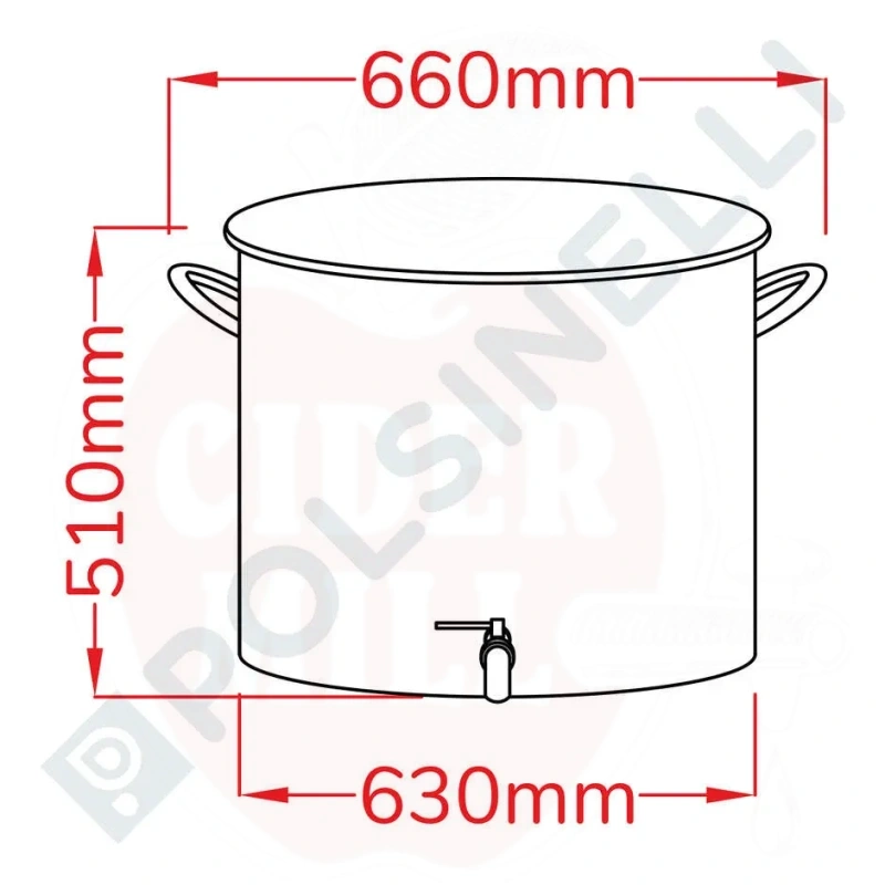 Tehnilised andmed: Materjal: AISI 304 roostevaba teras. Maht: 150L. Läbimõõt: 630mm. Kõrgus: 510mm. Seina paksus: 0,6mm. Põhja paksus: 0,6mm. Ümar ja keevitatud põhi (ei sobi otsese leegi kontaktiks).