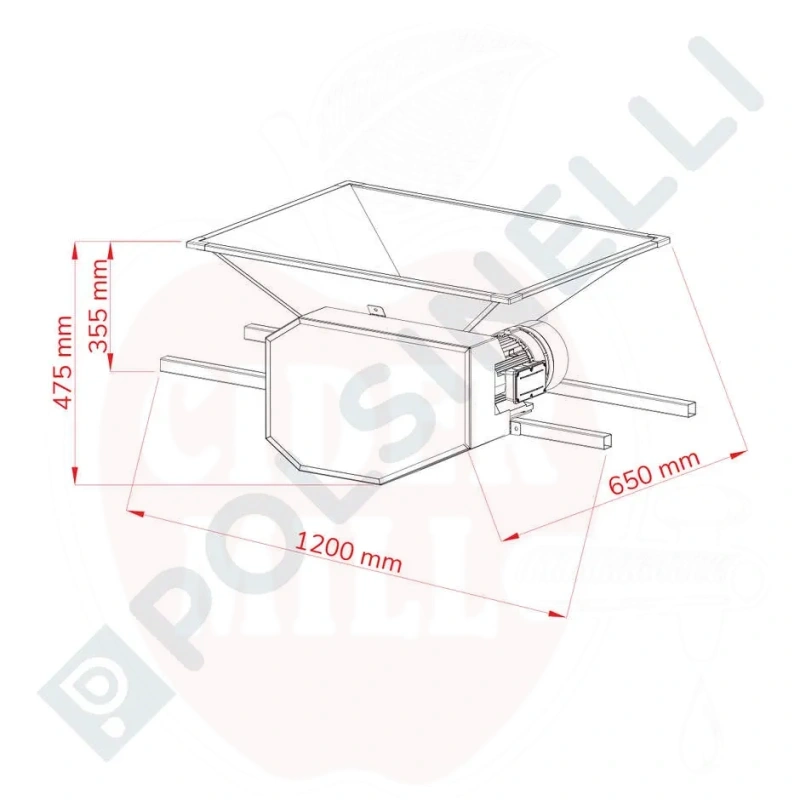 Tehnilised andmed: Mootor: 220V. Lehter: 850x620x330h mm. Kogumõõtmed: 1200x650x475h mm. Kaal: 28kg. Rulli läbimõõt: 280mm.