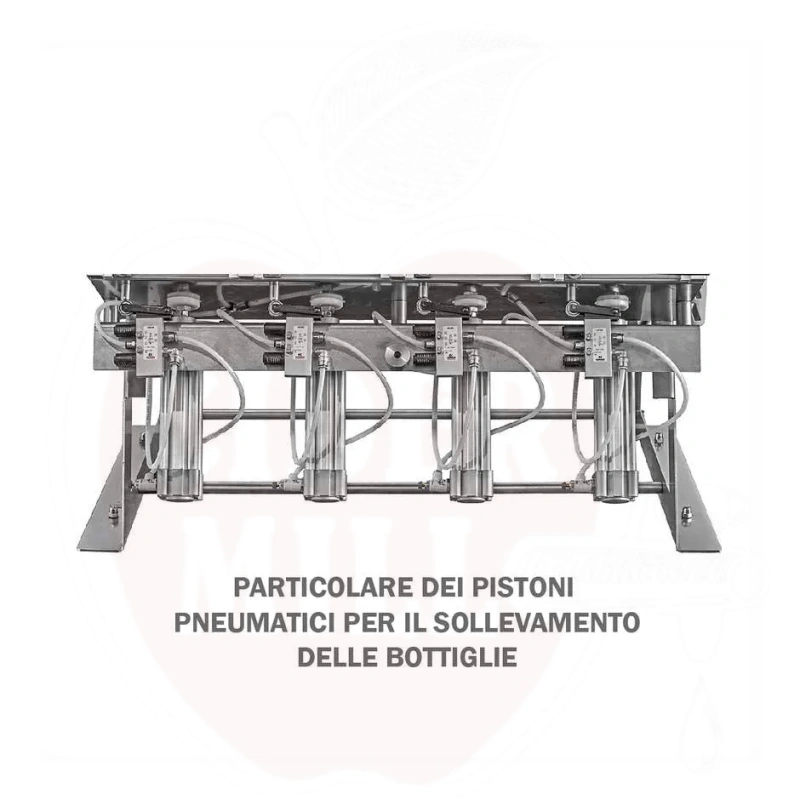 Omadused: Valmistatud roostevabast terasest koos laserlõigatud plaadi ja galvaanilise elektropoleerimisega kõigil tootega kokkupuutuvatel pindadel. Automaatne pudelite tõstmine pneumaatilise kolvi abil. Kiire vahetus pudeliformaatide vahel. Varustatud manomeetri, ohutusklapiga (sertifitseeritud ja testitud) ning lämmastiku/CO₂ reguleerimisklapiga.