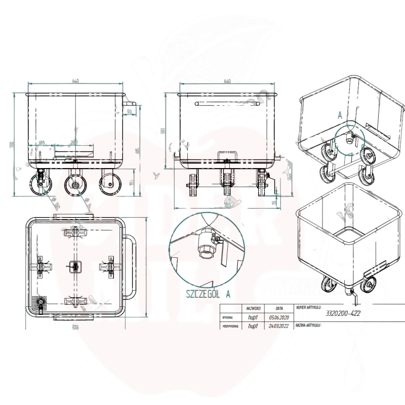 Mahuti-vann 200l, roostevaba, ventiil, rattad, 680x690x700mm