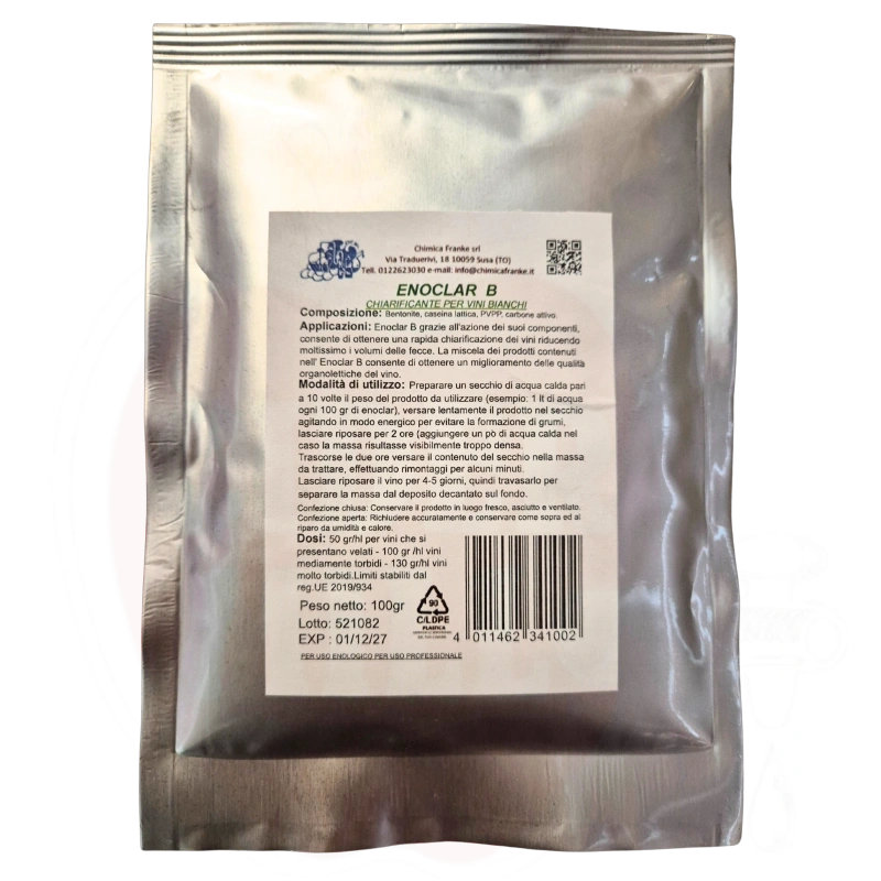 Enoclar B on tehokas viinin kirkastusaine, joka on kehitetty erityisesti valkoviinien käsittelyyn. Tämä laadukas tuote sisältää bentoniittia, maitokaseiinia, PVPP:tä ja aktiivihiiltä, varmistaen optimaalisen tuloksen viinien kirkastamisessa.