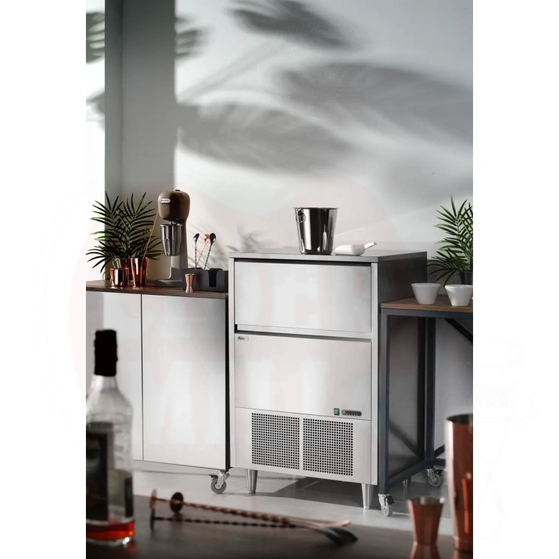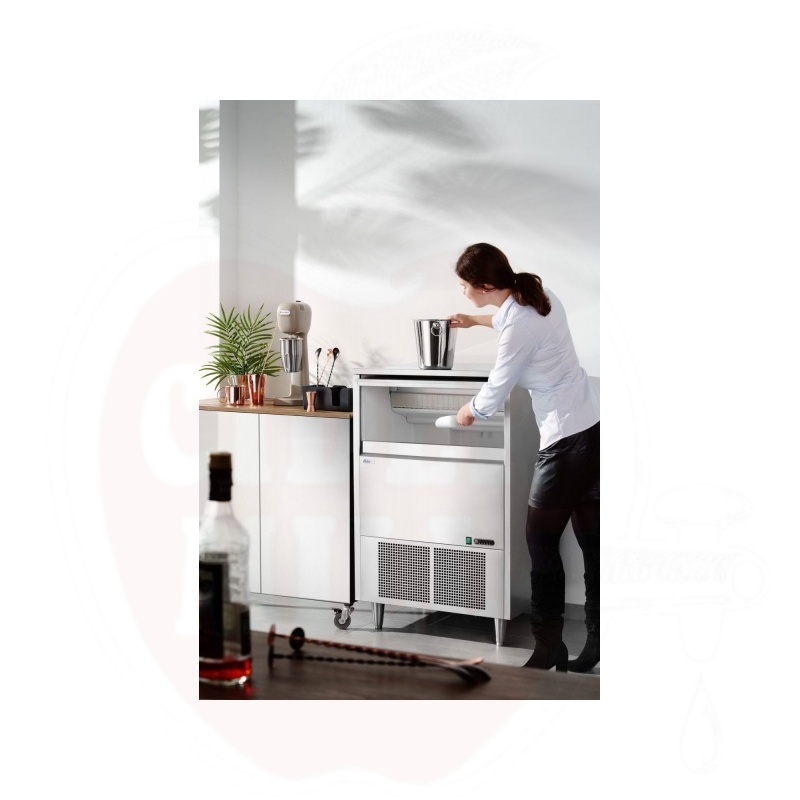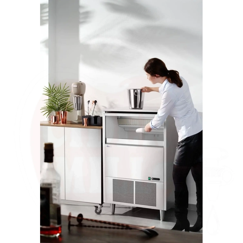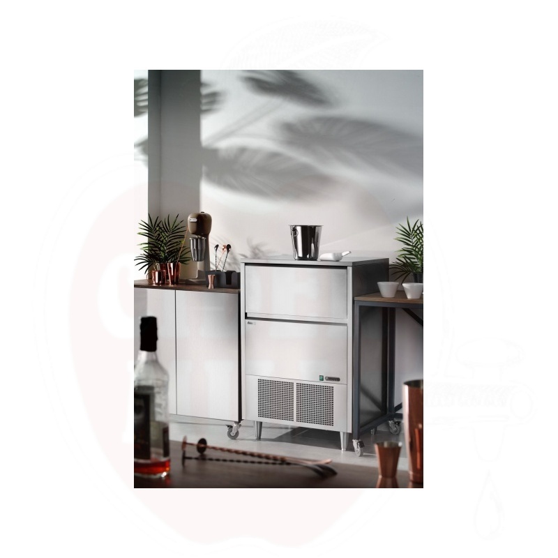 Energiatehokas tuulettimella varustettu staattinen ilmajäähdytysjärjestelmä ja ympäristöystävällinen R290-kylmäaine takaavat optimaalisen toiminnan. Laite tuottaa vuorokaudessa jopa 80 kg kristallinkirkkaita jääkuutioita, jotka säilyttävät muotonsa pidempään.