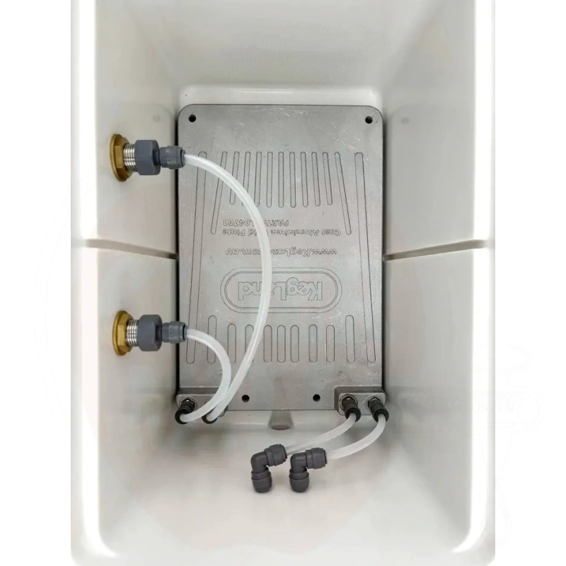 1. Yhdistä tynnyrit kylmälaatikon olutsisääntulon letkuihin. Täytä jäähdytyslevy oluella. On tärkeää täyttää jäähdytyslevyn putket ENSIN oluella. Jos putkissa on vettä ja sitten asetat jäähdytyslevylle erittäin kylmää jäätä, vesi putkissa voi jäätyä estäen nesteen virtauksen. Joten varmista, että putkissa on olutta, koska täysvahva olut jäätyy 4°C alemmassa lämpötilassa kuin vesi.