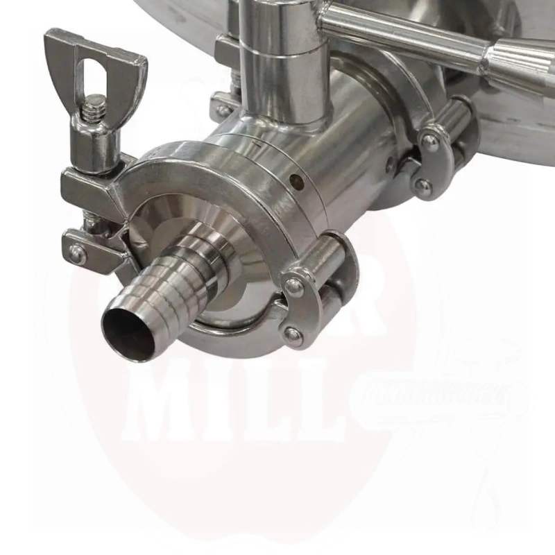 Se on vakiovarusteena TRI-CLAMP pikakytkentäjärjestelmällä, joka koostuu DN25 CLAMP 1" 1/2 ruostumattomasta teräksestä valmistetusta venttilistä PG 20 ruostumattomasta teräksestä valmistetulla letkuliittimellä, tiivisteillä ja CLAMP-kiinnikkeet. Tämän järjestelmän pääominaisuudet ovat helppo kokoaminen ja purkaminen, joihin ei tarvita työkaluja, ja helppo puhdistus tasaisten liitosten ansiosta. 50L kattila on myös varustettu ammattimaisella analogisella lämpömittarilla, jossa on anturi tuotteen kypsennyslämpötilan helpoksi valvomiseksi, kannella, jossa on ruostumattomasta teräksestä valmistettu nuppi ja kahvat.