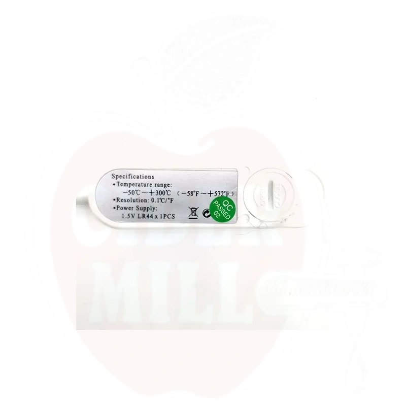 Tekniset tiedot: Lämpötila-alue: -50°C ~ +300°C (-58°F ~ +572°F). Erotuskyky: 0,1°C/F. Anturi: 4mm ruostumaton teräs. Virtalähde: 1 x 1,5V paristo (LR44). Mitat: 245 x 25mm.