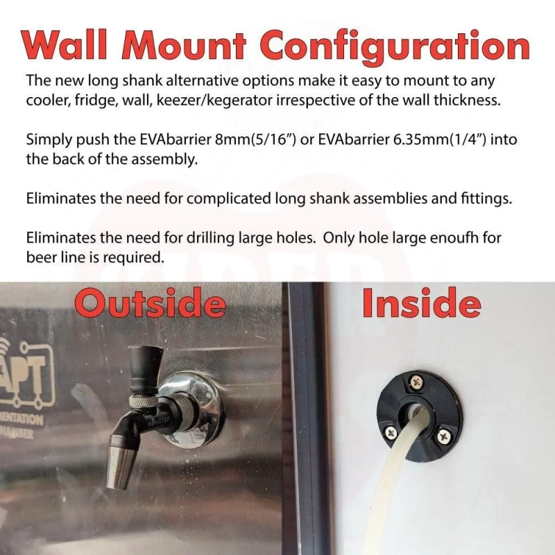 Useimmat tavanomaiset oluthanat vaativat suuren 22mm reiän, joka on porattava keezer/jäähdyttimen/seinän läpi. Perinteiset pitkät varret ovat myös yleensä suuren nesteetilavuuden kanssa, joka istuu seinän sisällä jäähdyttämättömänä, mikä ei ole ihanteellinen. Tämä uusi pitkä varsi vaihtoehto on suunniteltu sopimaan mihin tahansa seinän paksuuteen ja vähentää huomattavasti pysähtynyttä olutta, joka istuu itse varressa. Seinille 80mm paksuja olemme toimittaneet kolme ruuvia, mutta jos seinä on paksumpi, voit myös käyttää 6 pientä puusuutta tai jotain vastaavaa ja kiinnittää kolme ruuvia edestä ja 3 takaa, jolloin voit mennä mihin tahansa seinätyyppiin.