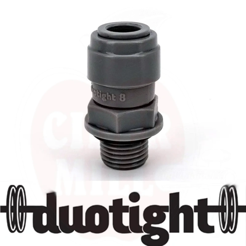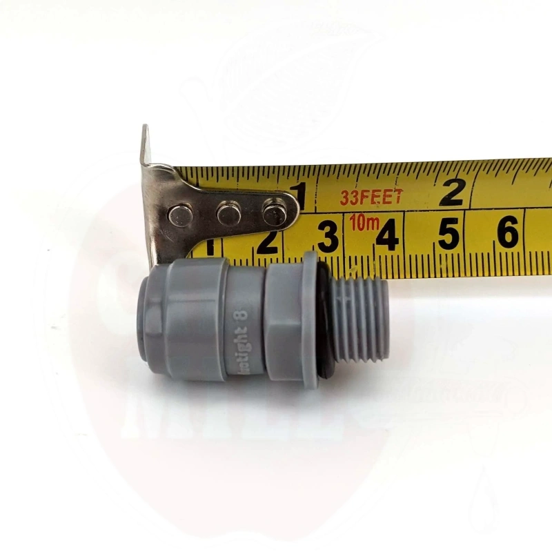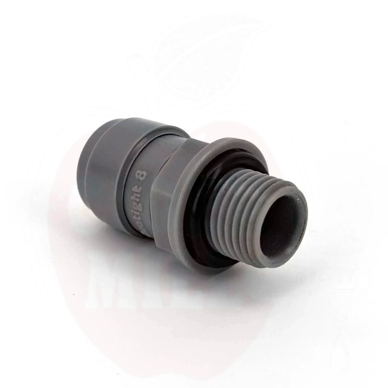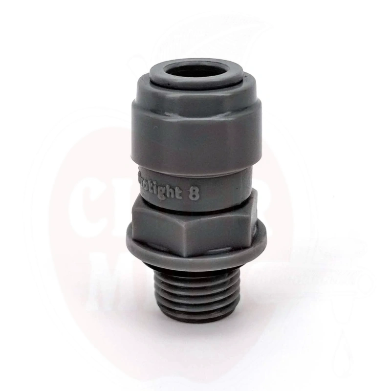 Tekniset tiedot: Kierre: 1/4" BSP ulkokierre. Letkun liitäntä: 8mm ulkohalkaisija push-in. Materiaali: EPDM o-renkaat (eteeni-propeeni kumi). Suurin käyttöpaine: 100 psi. Sopii kaasu- ja nestesovelluksiin. Lämpötila-alue: Kemiallisesti kestävä otsonille, öljyille, laajalle valikoimalle emäksisiä ja happamia yhdisteitä, vedelle, alkoholille, ketonille ja juomille. BPA-vapaa.