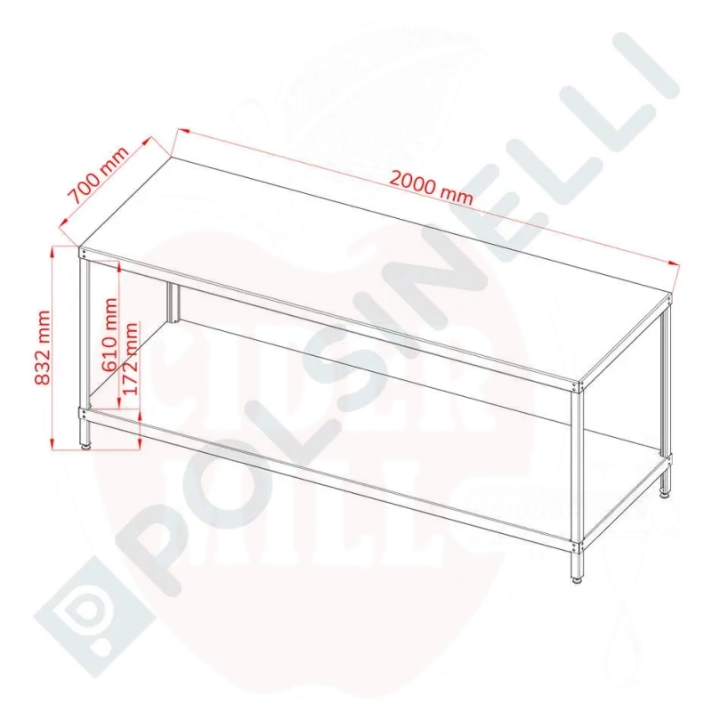 Pöytä 200x70cm hyllyllä ruostumaton teräs
